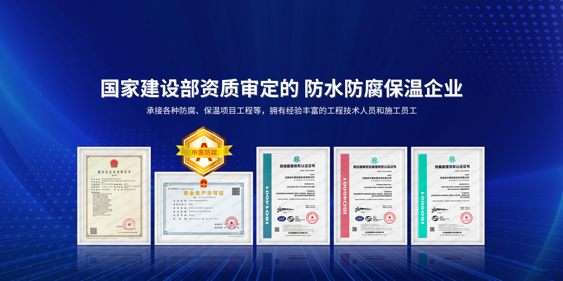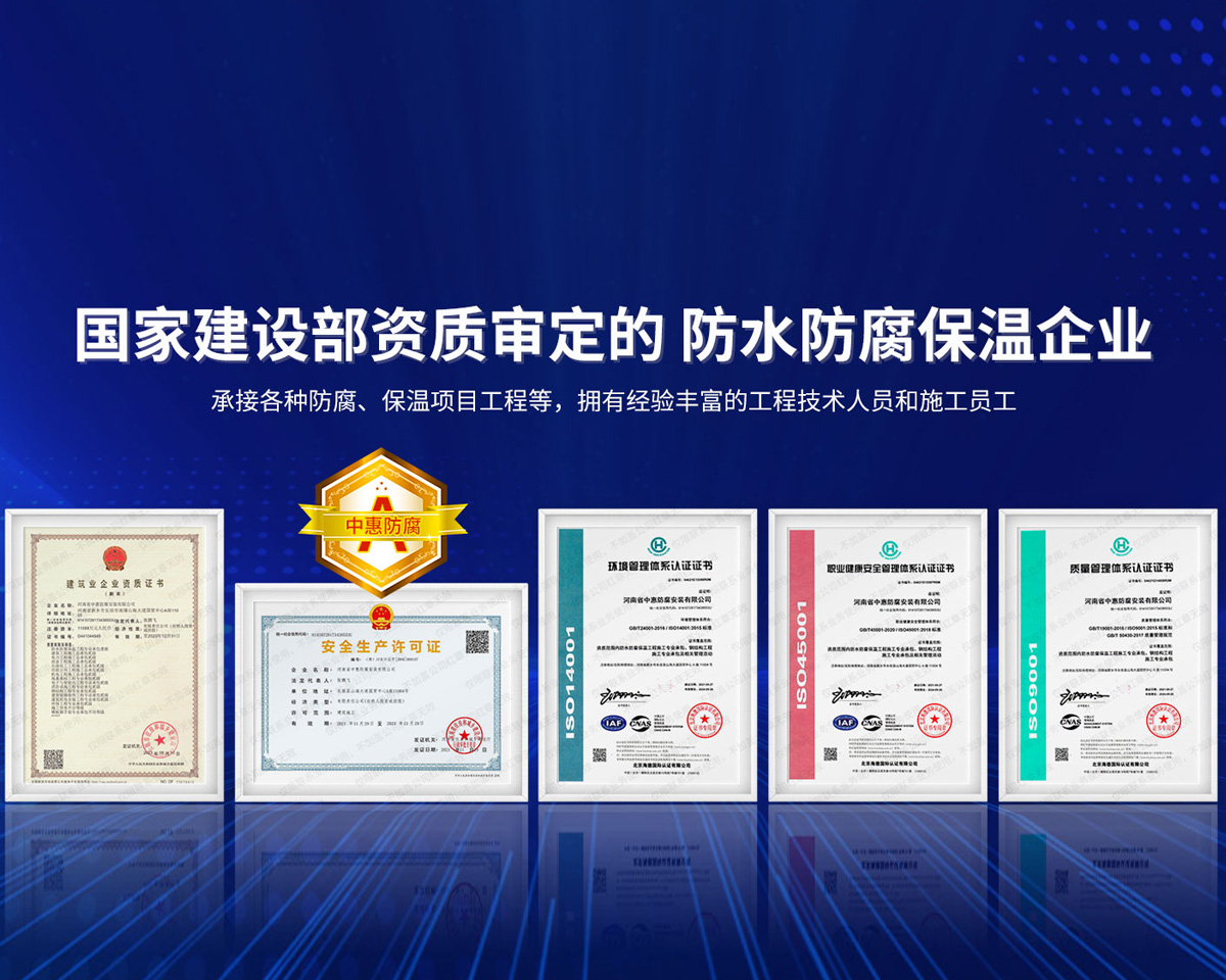 公司經營范圍:防水防腐保溫工程;消防設施工程;建筑裝修裝飾工程;建筑機電安裝工程;電力工程;建筑工程;石油化工工程;工業清洗工程;油罐清洗工程;鋼結構工程;環保工程;模板腳手架工程;電纜防火封堵、防污閃噴涂、外墻外保溫工程;各類施工勞務作業;設備維修、船舶鉚焊、涂裝;電力工程材料、建材、防水材料、防火材料、防腐保溫材料銷售,并相繼通過了GB/T19001-2008idtISO9001:2008GB/T50430-2007質量管理體系認證證書。GB/T24001-2004idtISO14001:2004環境管理體系認證證書。GB/T28001-2011idtOHSAS18001:2007職業健康安全管理體系認證證書。公司是中國防腐蝕于防護協會、中國施工企業管理協會、電力協會和中國鋼結構防水協會會員單位。 公司的經營業務涵蓋了石油、化工、電力、冶金、煤炭、船舶、國防、燃氣、水利、環保、交通運輸、航空及國防軍工和輕紡市政等行業的防腐保溫絕熱設備。鋼結構安裝、防火、防水、金屬噴鍍、聚脲噴繪、陰極保護、防滲透堵漏、玻璃鋼及各種磚版材料襯里、橡膠襯里、煙氣硫和耐酸溶劑腐蝕等工程施工。公司連續十年榮獲“省市先進施工企業”“安全生產先進單位”“重合同,守信用企業”和“AA***資質企業”的稱號。2000年被命名為市級文明單位,2002年被國家工商行政管理局命名為“重合同,守信用的企業”、被中國工業防腐蝕技術協會命名為“防腐蝕企業,能源節約及環境保護領域有豐富的經驗和***的業績。工程一次交驗合格率100%。其中攀枝花鋼鐵公司煉鐵廠四號高爐及熱風爐防腐工程、上海寶鋼公司煤氣柜防腐工程、撫順石油一廠裝置防腐項目、齊魯石化公司稀烴廠高塔防腐工程、吉林化學工業公司煉油廠油罐防腐工程、天津石化熱電廠六號爐頂棚聯絡管保溫工程、大慶油田(太倉)力神泵業工程、中國化學工程第十一建設工程、中原油田勘探局工程、中國石化銷售有限公司華北分部、魯皖輸油管道工程、貴州開磷息烽合成氨工程、陜西黃陵煤化工程、中國石油天然氣西部管道塔里木輸油工程、邯鋼集團邯寶鋼鐵公司煉鐵工程、德州供電工程、吉寶(南通)船廠工程,偃師華潤熱力工程、鄭州熱力總公司。 河南省中惠防腐安裝有限公司愿以豐富的施工經驗,***的技術,***的設備,***的管理,***的服務,竭誠為國內外廣大的用戶提供***滿意、******的工程作品。 我公司愿與國內外同仁一道,團結協作,共同推進防腐蝕行業發展! 公司地址:河南省長垣縣建設路北段360號 固定電話:0373-8866488 郵編:453400 網址:http://www_zhff_com_cn.jsxiyan.com